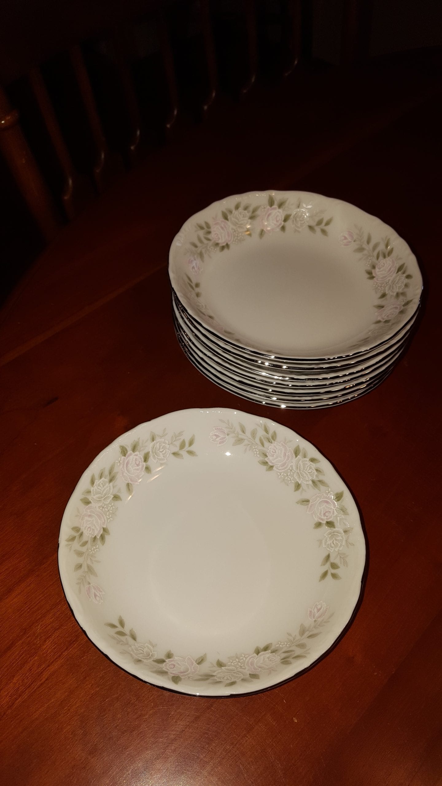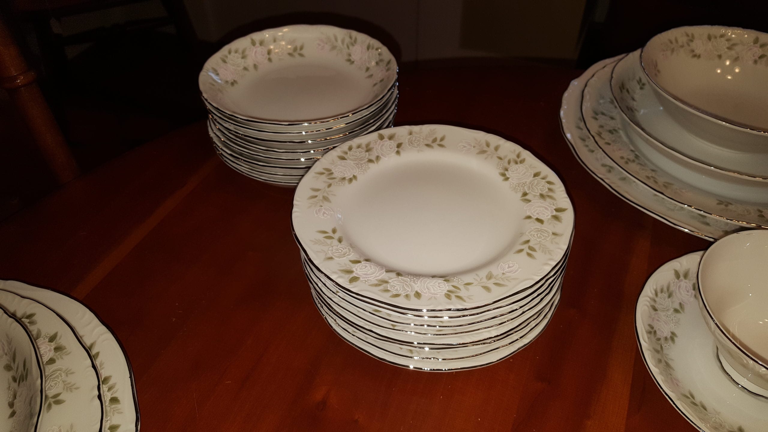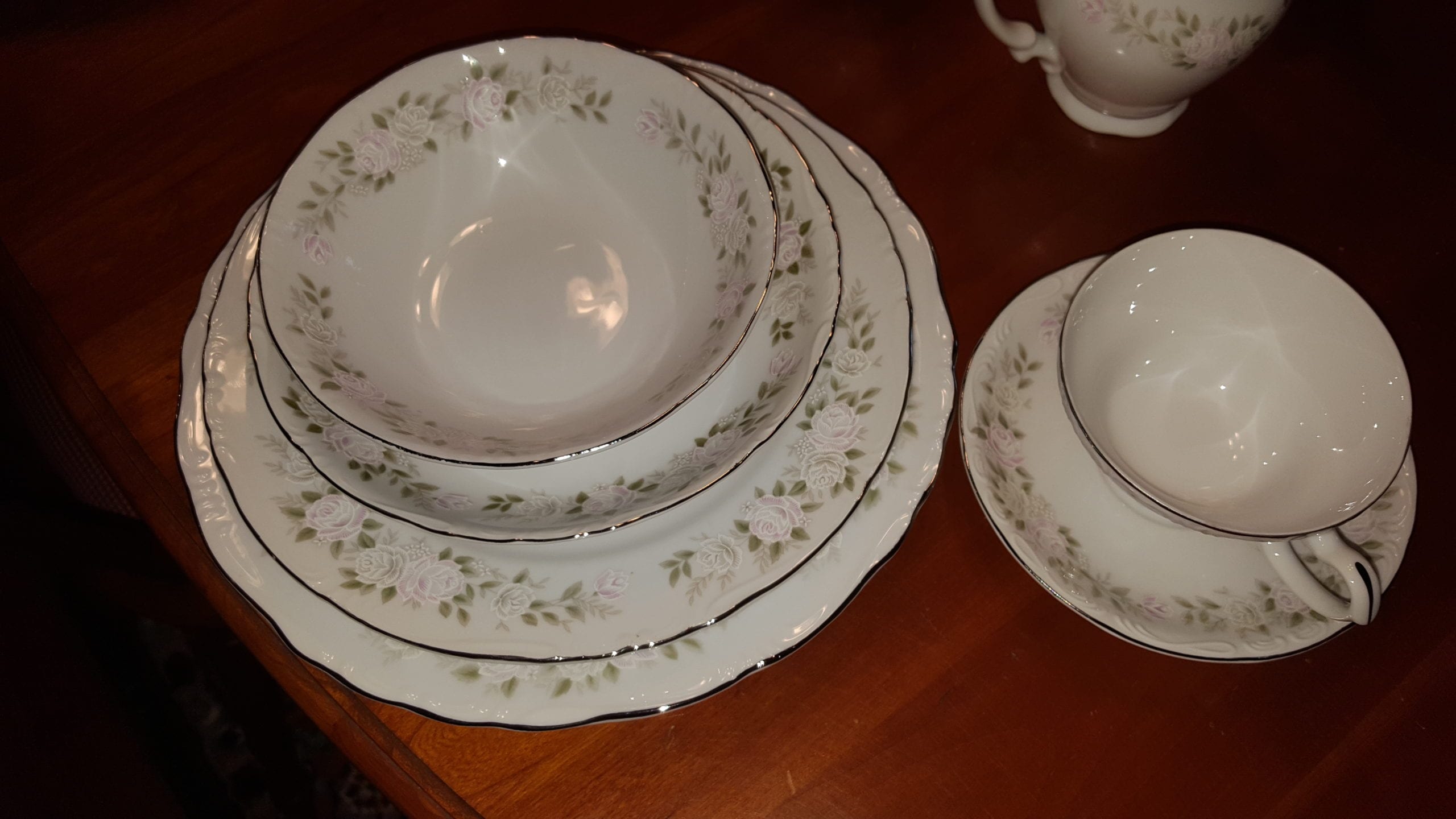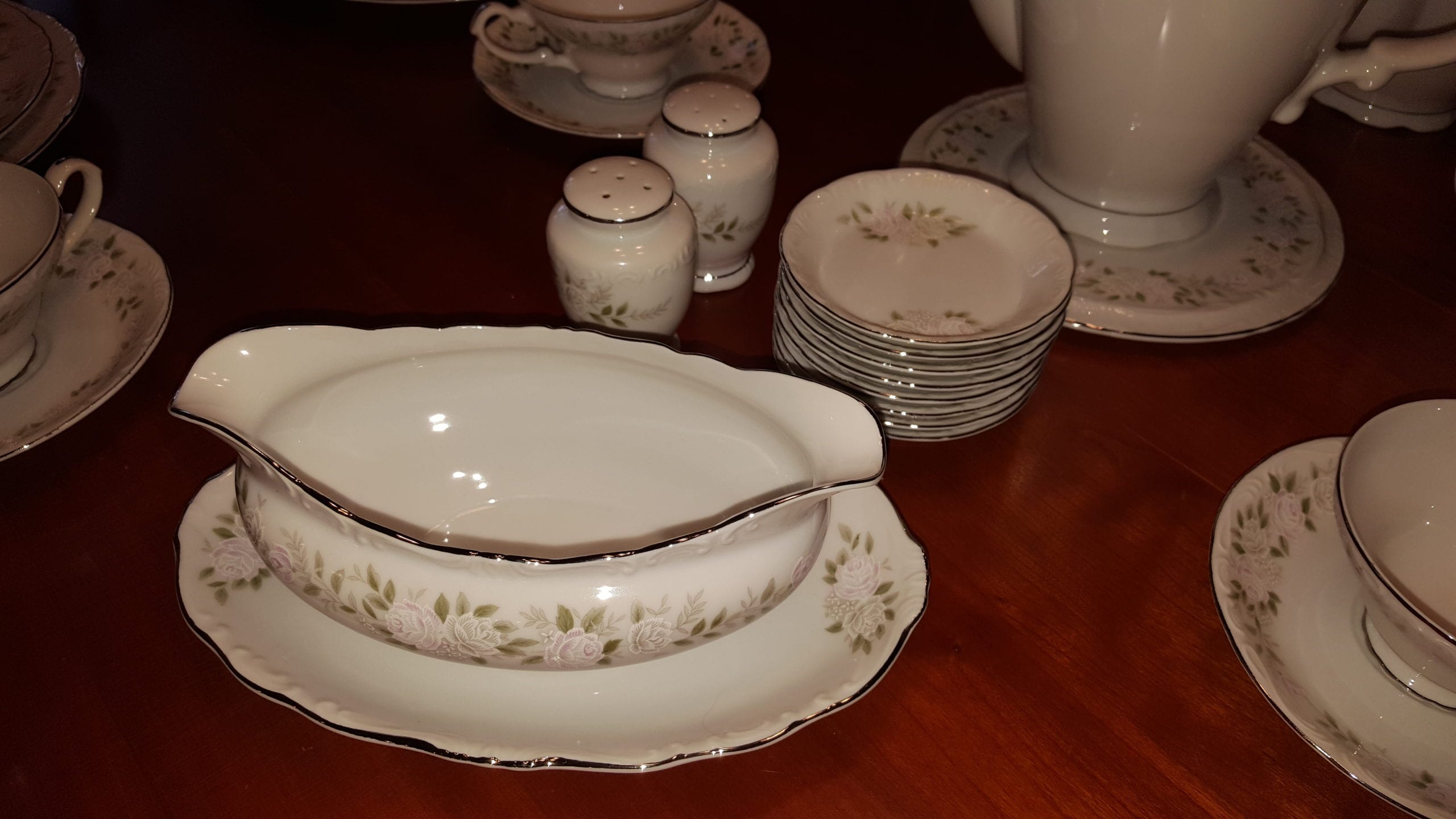 Sheffield Classic 501 pattern vintage china, delicate rose floral spray with light pink and soft gray hues. Platinum guilding. Excellent shape, no chips, no cracks, no ware on dishes, no crazing, no fading. The easiest and most cost affective way to own and enjoy a complete set of fine china and preserve history at the same time.