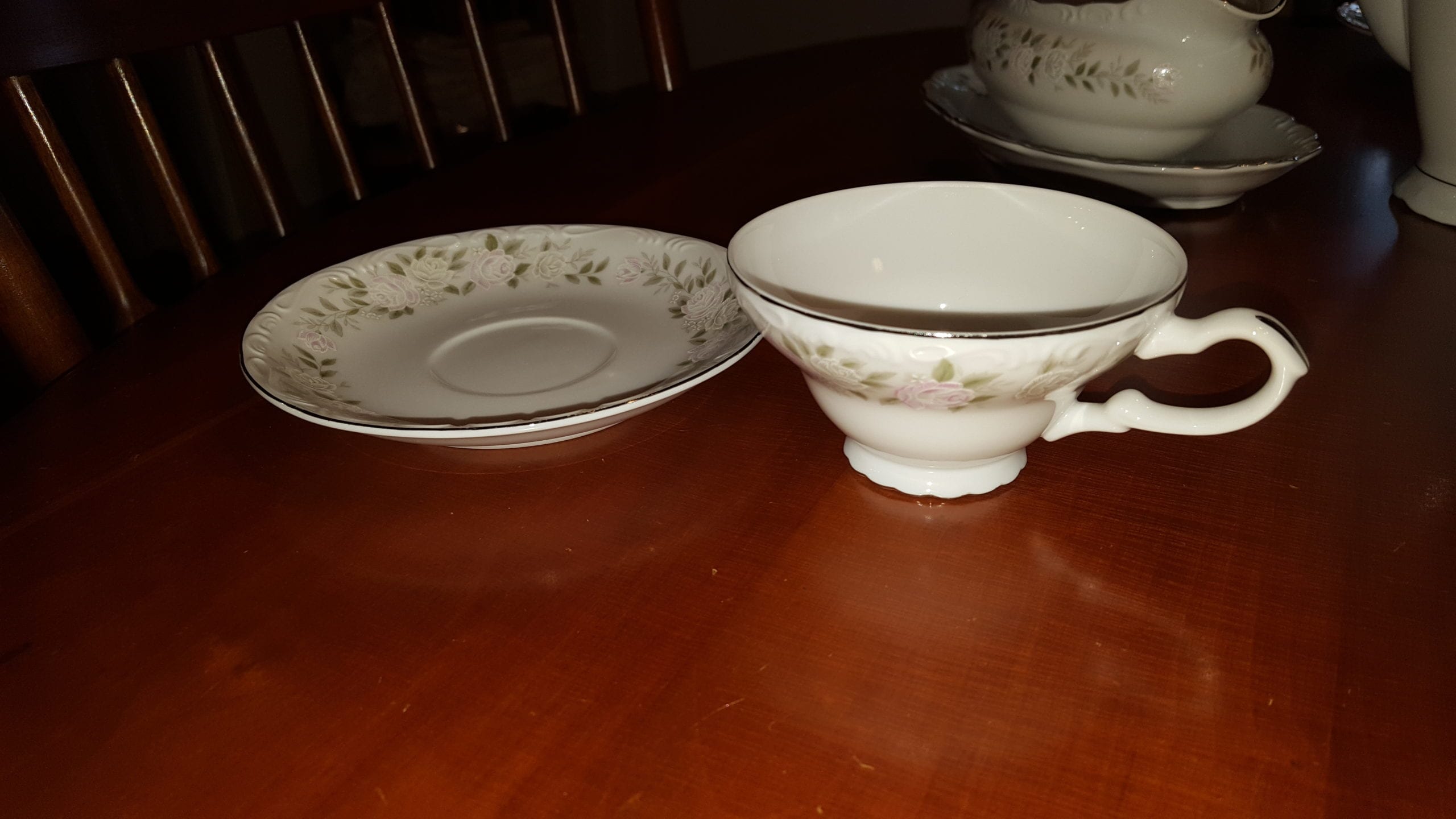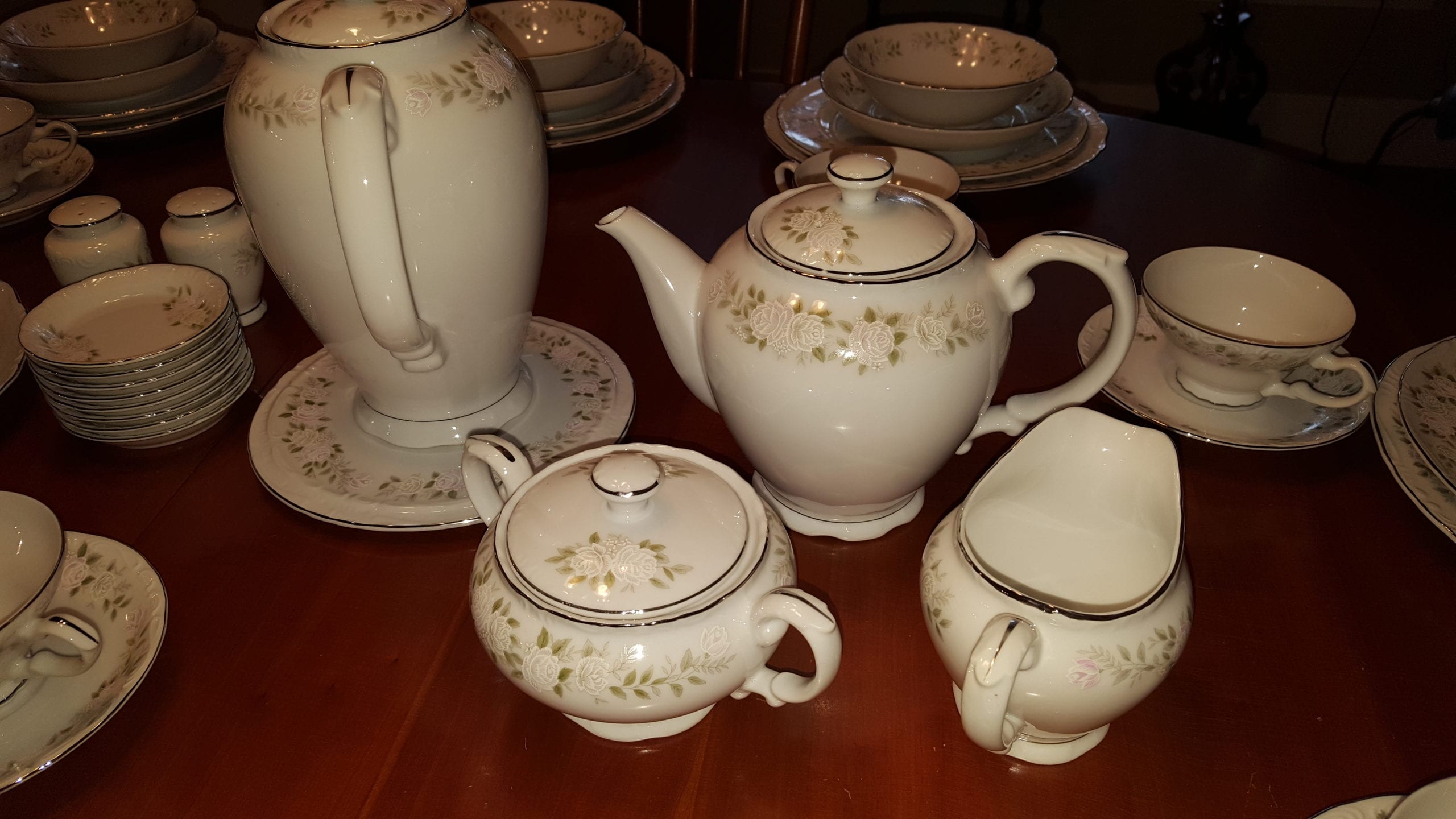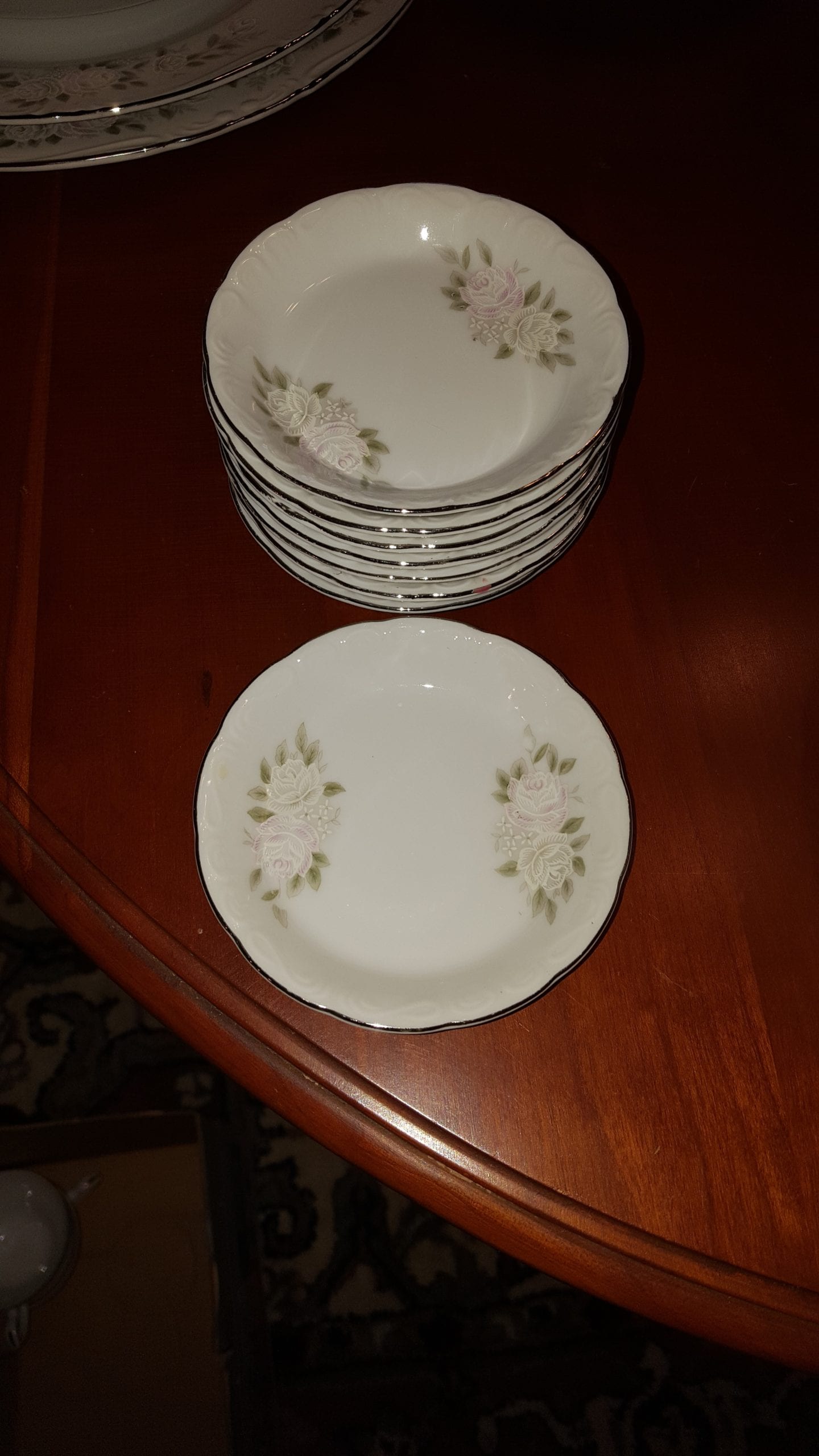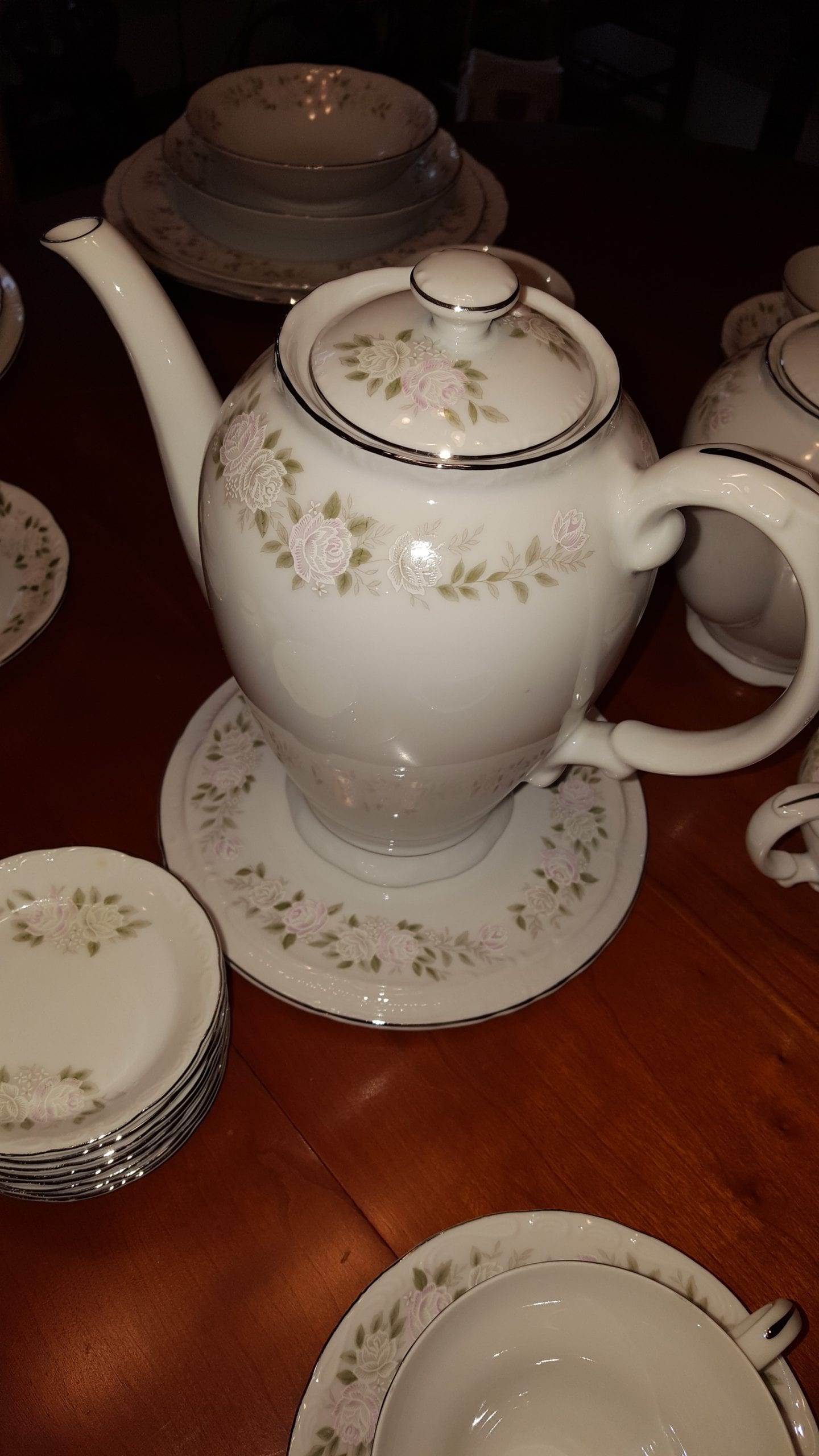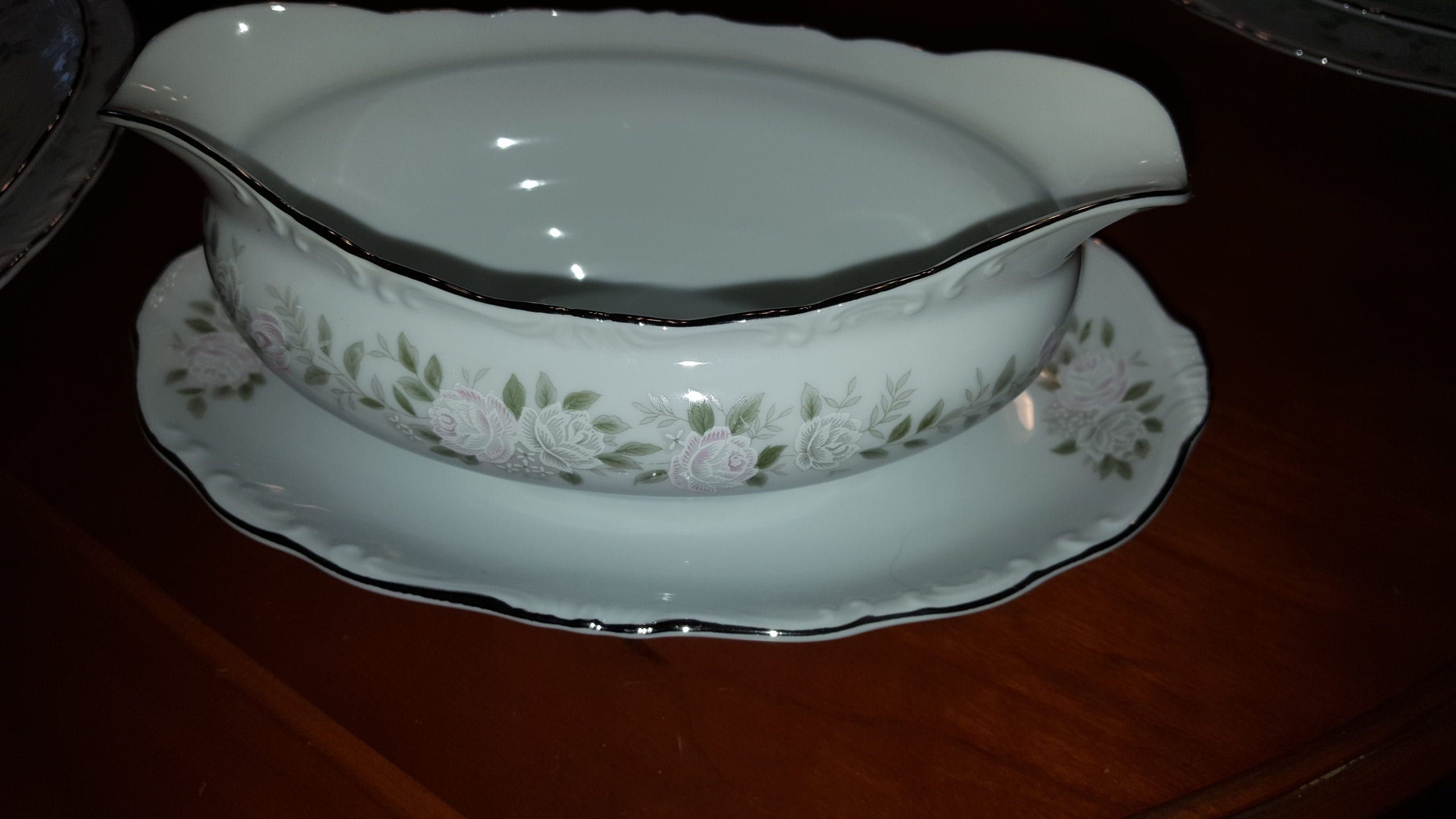 Sheffield Classic 501 pattern vintage china, delicate rose floral spray with light pink and soft gray hues. Platinum guilding. Excellent shape, no chips, no cracks, no ware on dishes, no crazing, no fading. The easiest and most cost affective way to own and enjoy a complete set of fine china and preserve history at the same time.