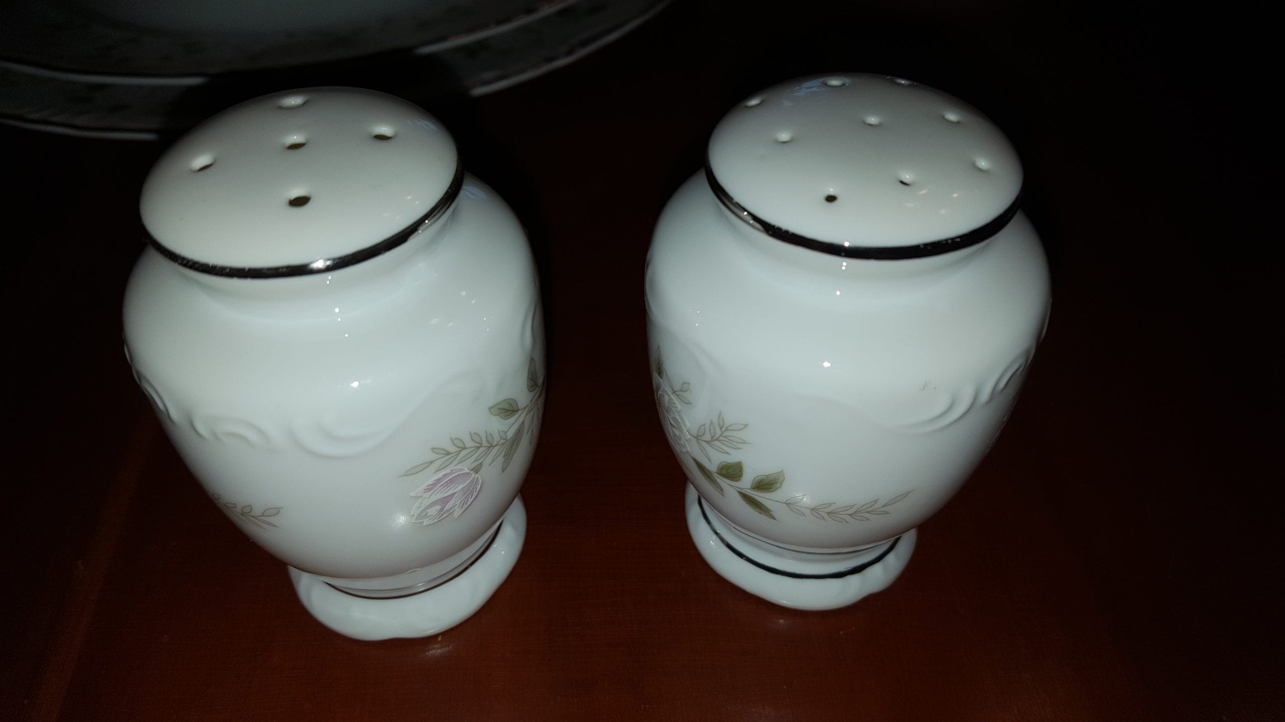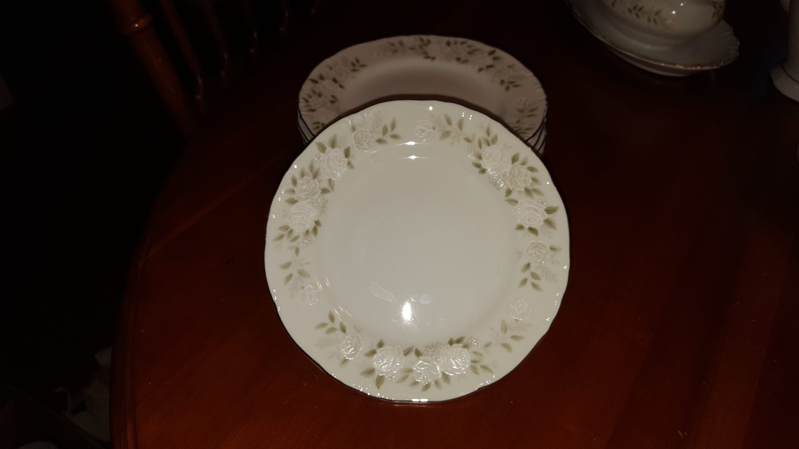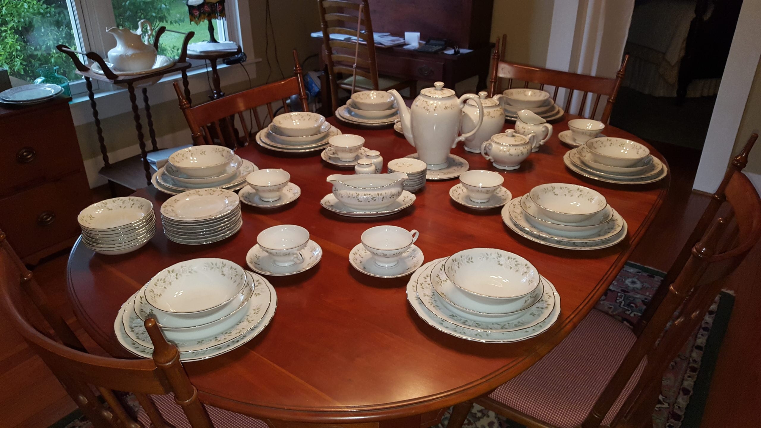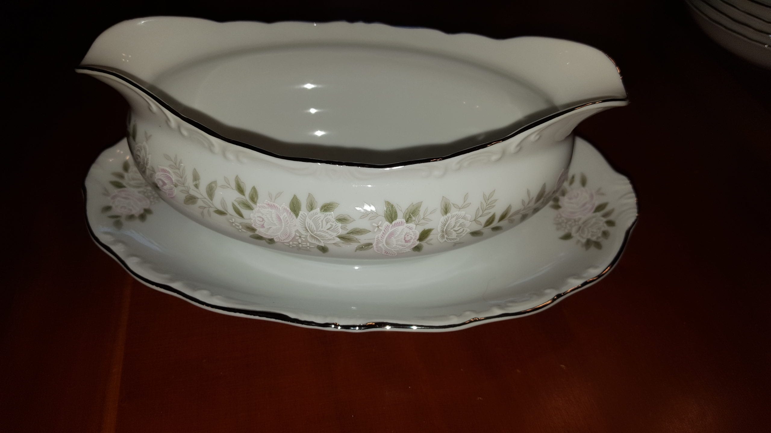 Sheffield Classic 501 pattern vintage china, delicate rose floral spray with light pink and soft gray hues. Platinum guilding. Excellent shape, no chips, no cracks, no ware on dishes, no crazing, no fading. The easiest and most cost affective way to own and enjoy a complete set of fine china and preserve history at the same time.