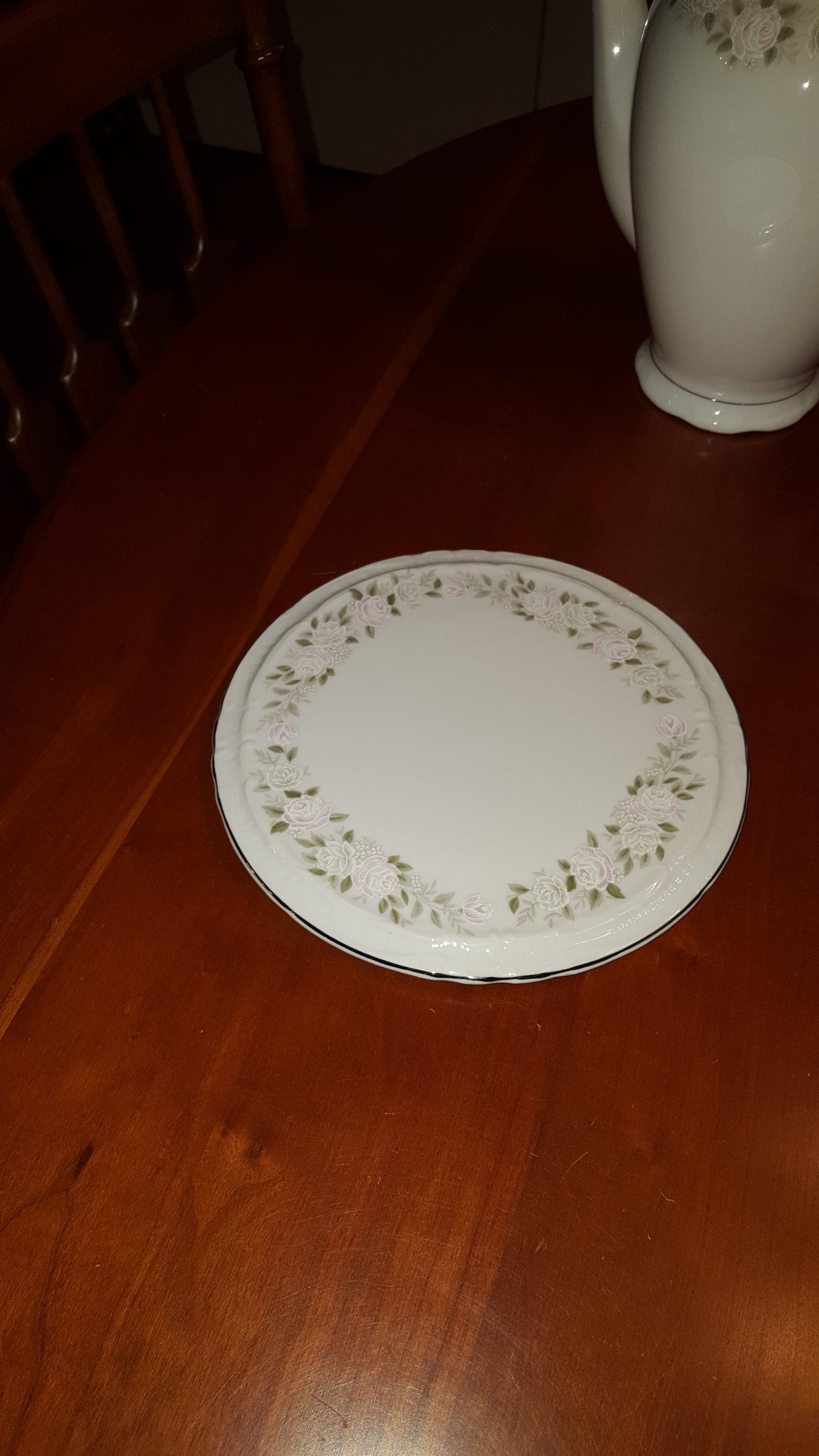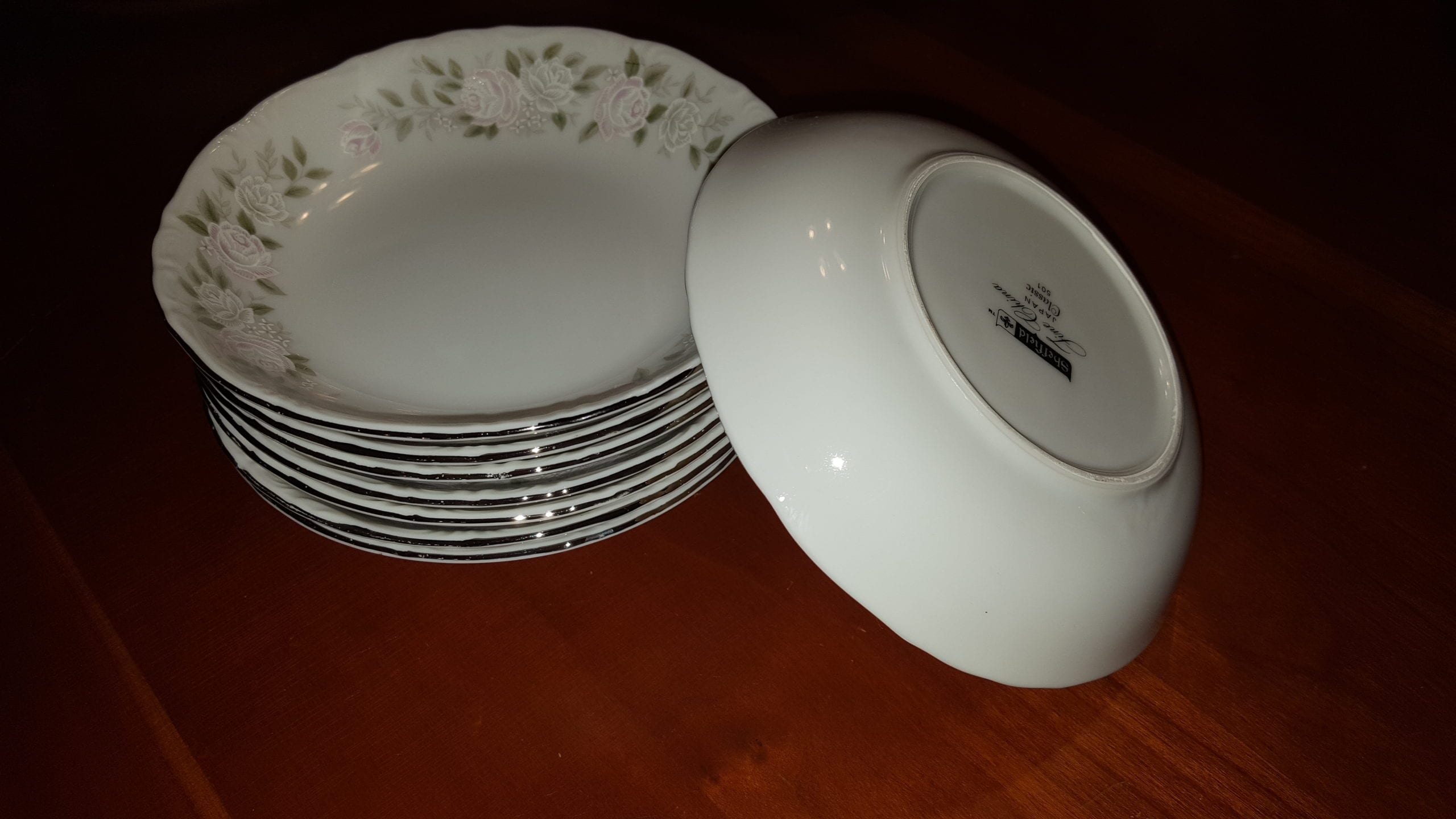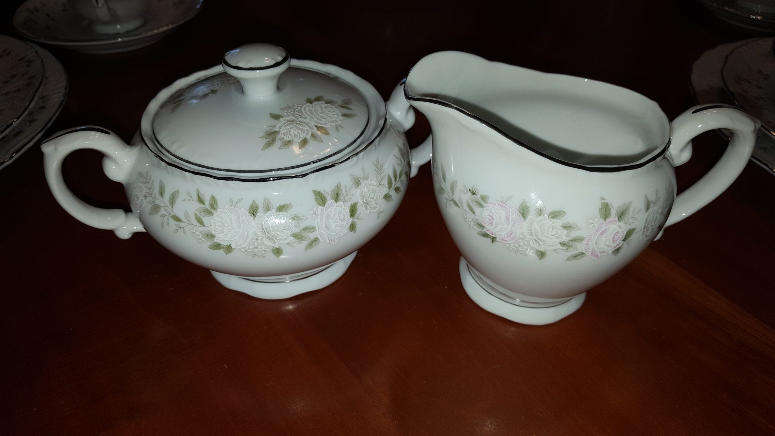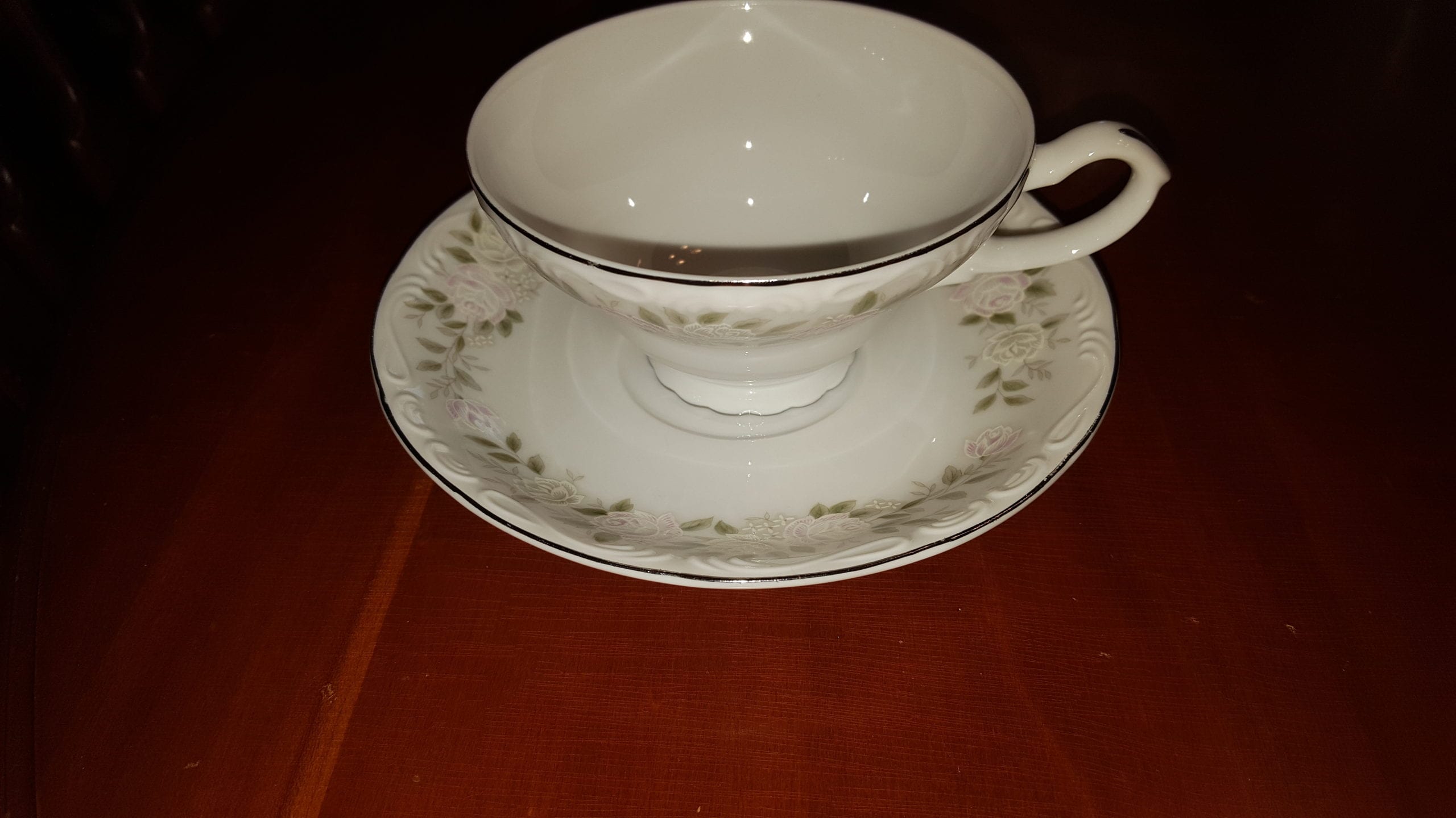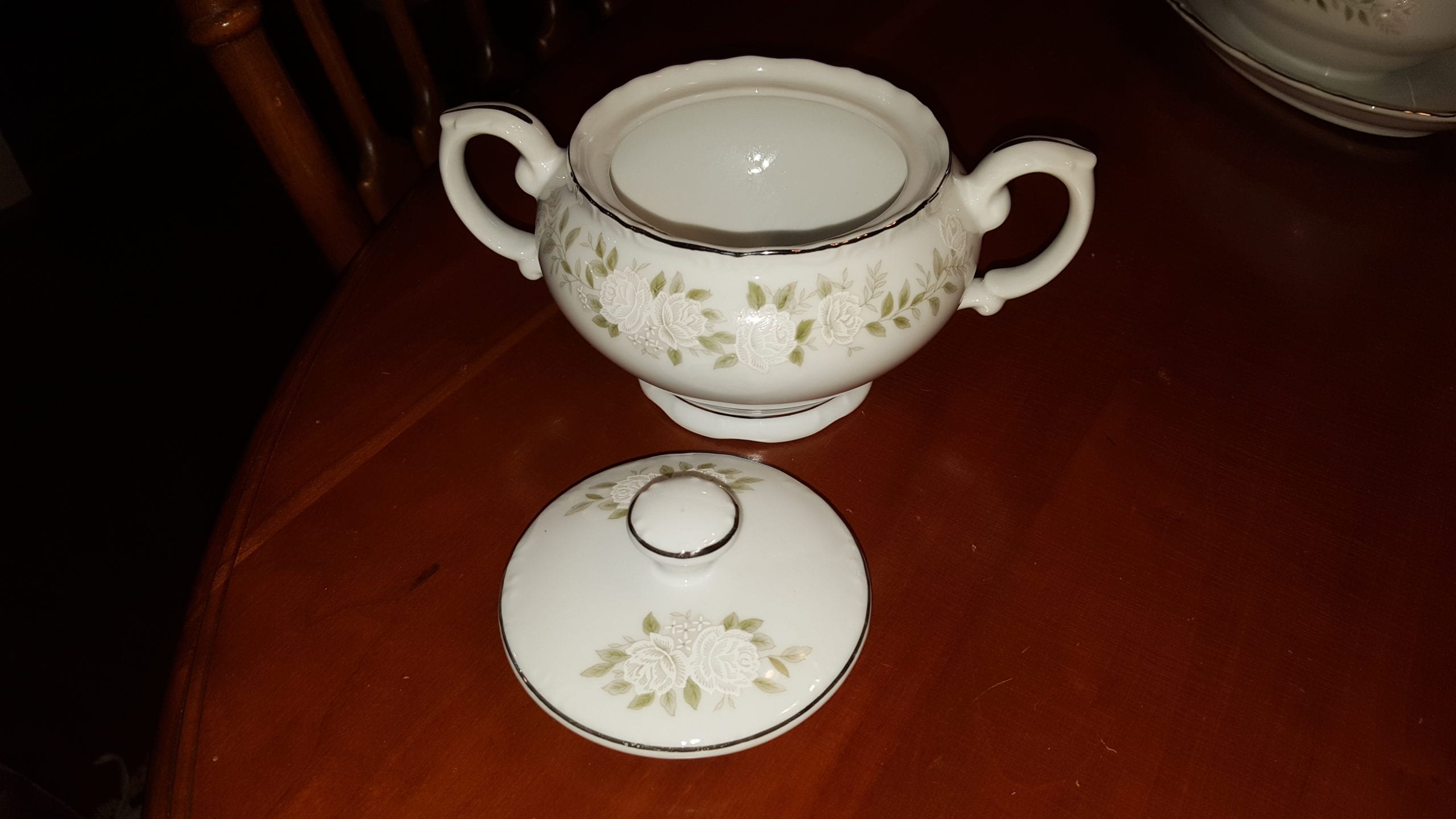 Sheffield Classic 501 pattern vintage china, delicate rose floral spray with light pink and soft gray hues. Platinum guilding. Excellent shape, no chips, no cracks, no ware on dishes, no crazing, no fading. The easiest and most cost affective way to own and enjoy a complete set of fine china and preserve history at the same time.