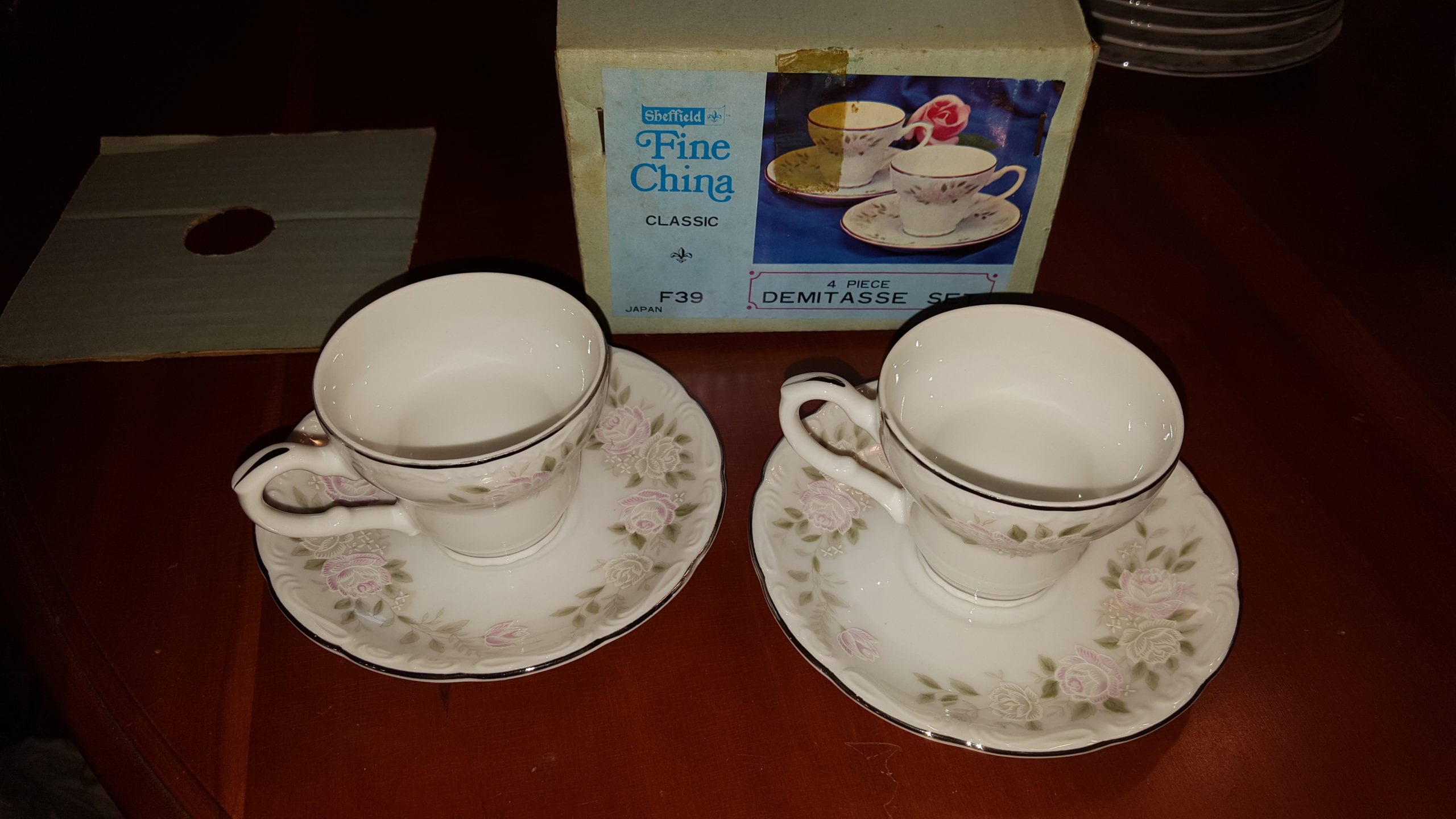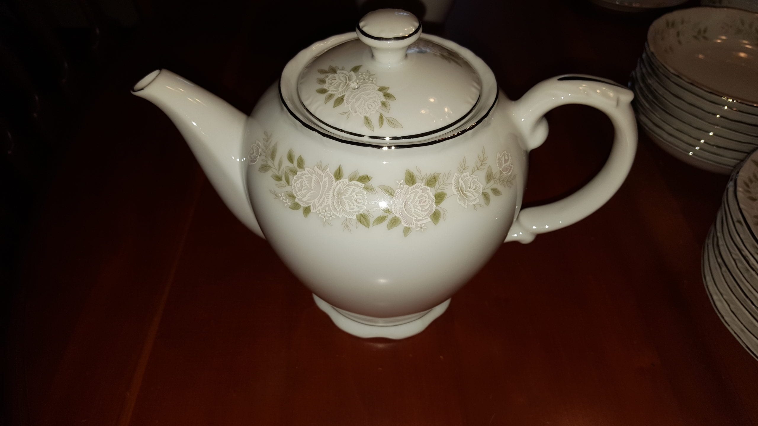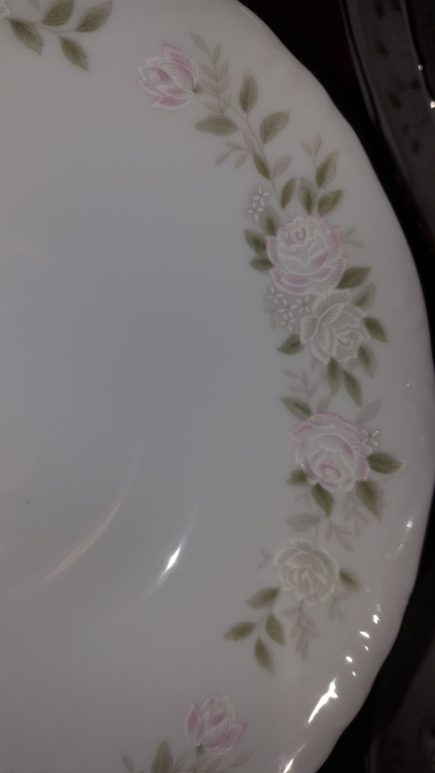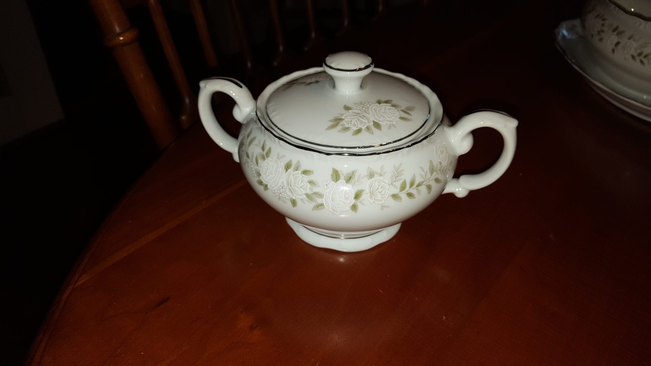 Sheffield Classic 501 pattern vintage china, delicate rose floral spray with light pink and soft gray hues. Platinum guilding. Excellent shape, no chips, no cracks, no ware on dishes, no crazing, no fading. The easiest and most cost affective way to own and enjoy a complete set of fine china and preserve history at the same time.