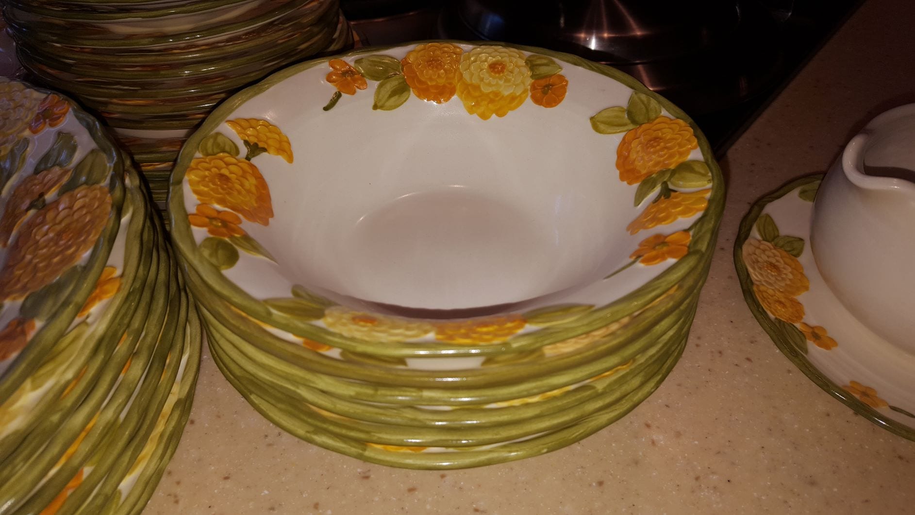 Metlox California Poppytrail “Zennia” Soup and Salad Bowl. Excellent Condition, Beautiful summer pattern of white background with bright yellow and orange zennia sculptured flowers. Made in USA in California. Oven safe, dishwasher safe, sculptured durable hand decorated, Item T17