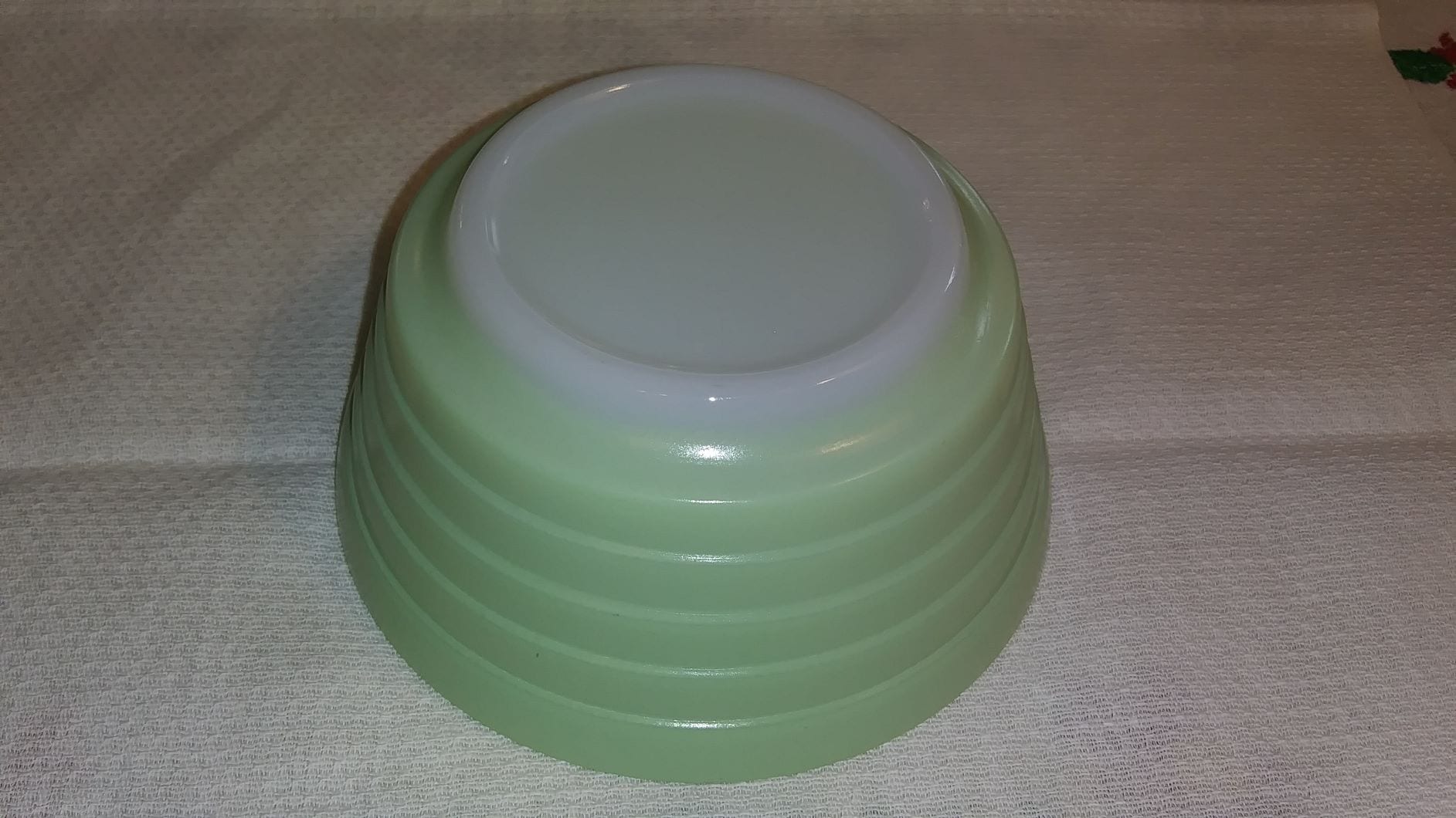 Moderntone Platonite by Hazel Atlas, Fired on Colors from the 1940’s to 50’s. Green deep cereal bowl. Excellent condition. Measures 5″Dia x 2 1/4″ Tall. Very similar to jadeite color and look.
