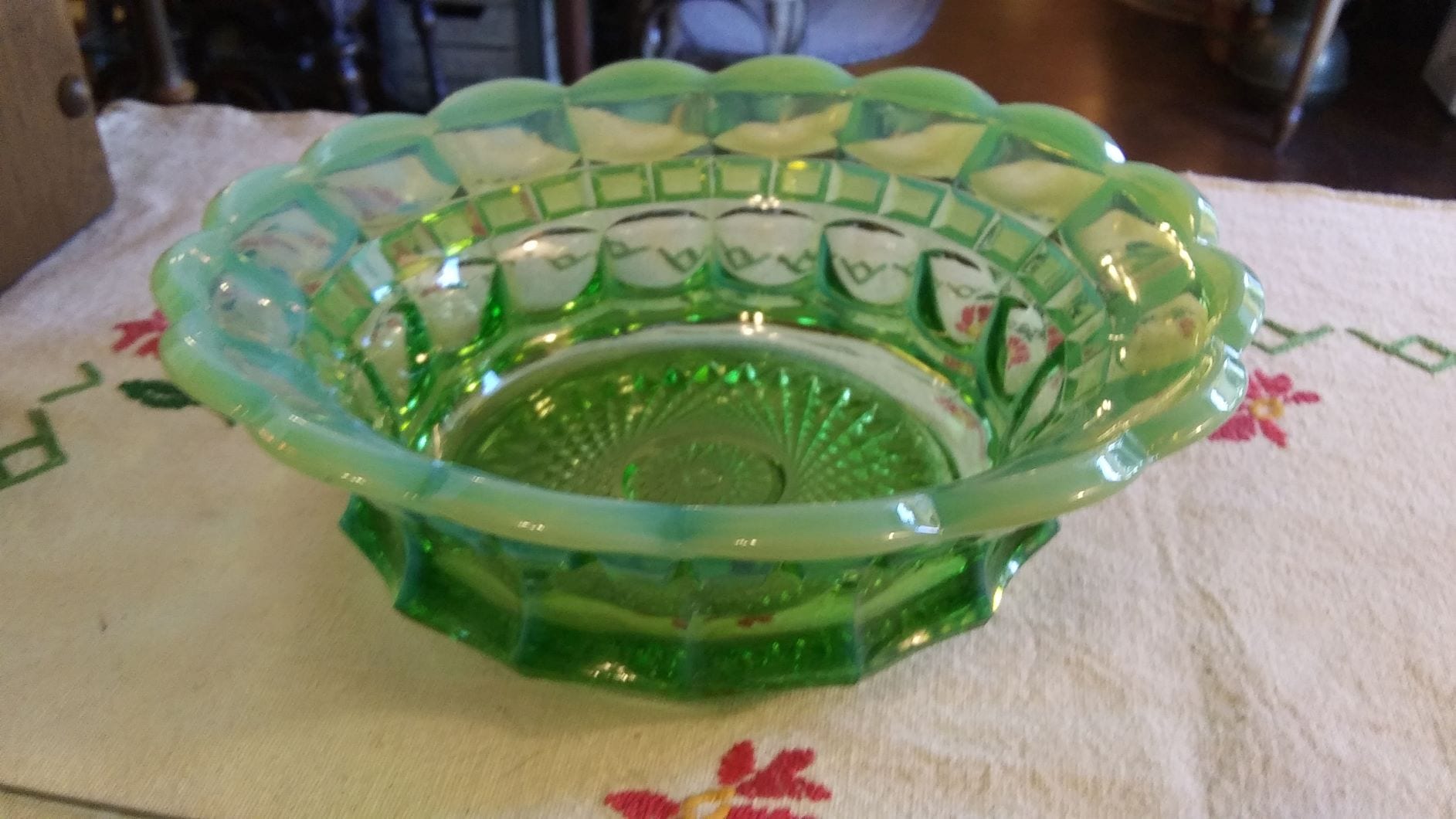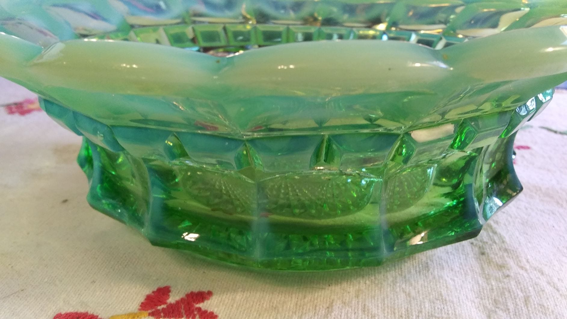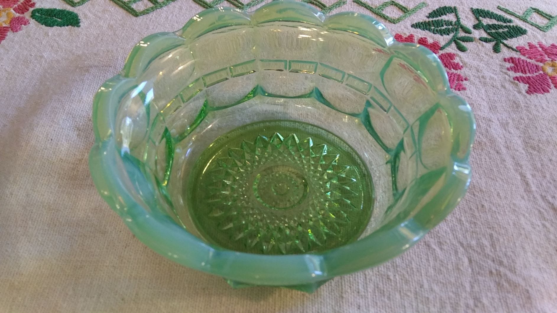 (3) Bowls sold as set, Northwood Opalescent, Circa 1905-1915, Beautiful shades of green. One large bowl measures 8.75″ D x 3″T, Two smaller bowls measures 4.5″D x 2″T, All are in excellent condition and are marked with “N” in the center of bowls. (NOTE: the green has a glow to it and could possibly be vaseline glass), Item 634