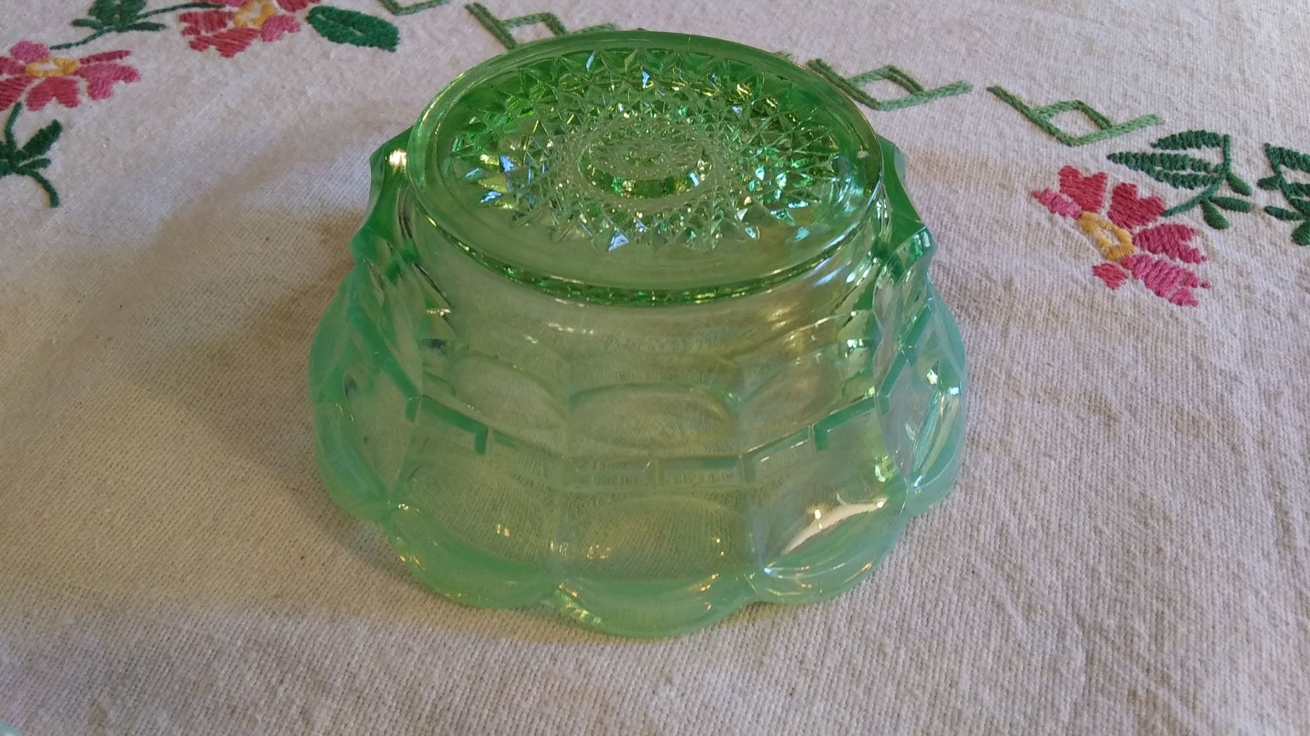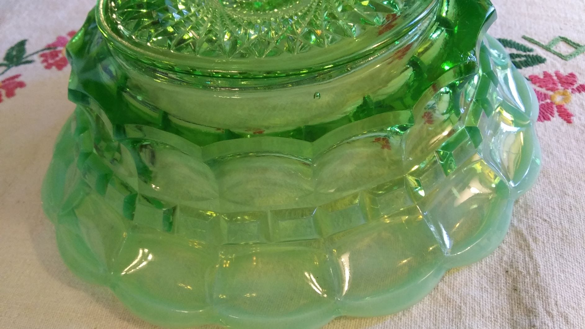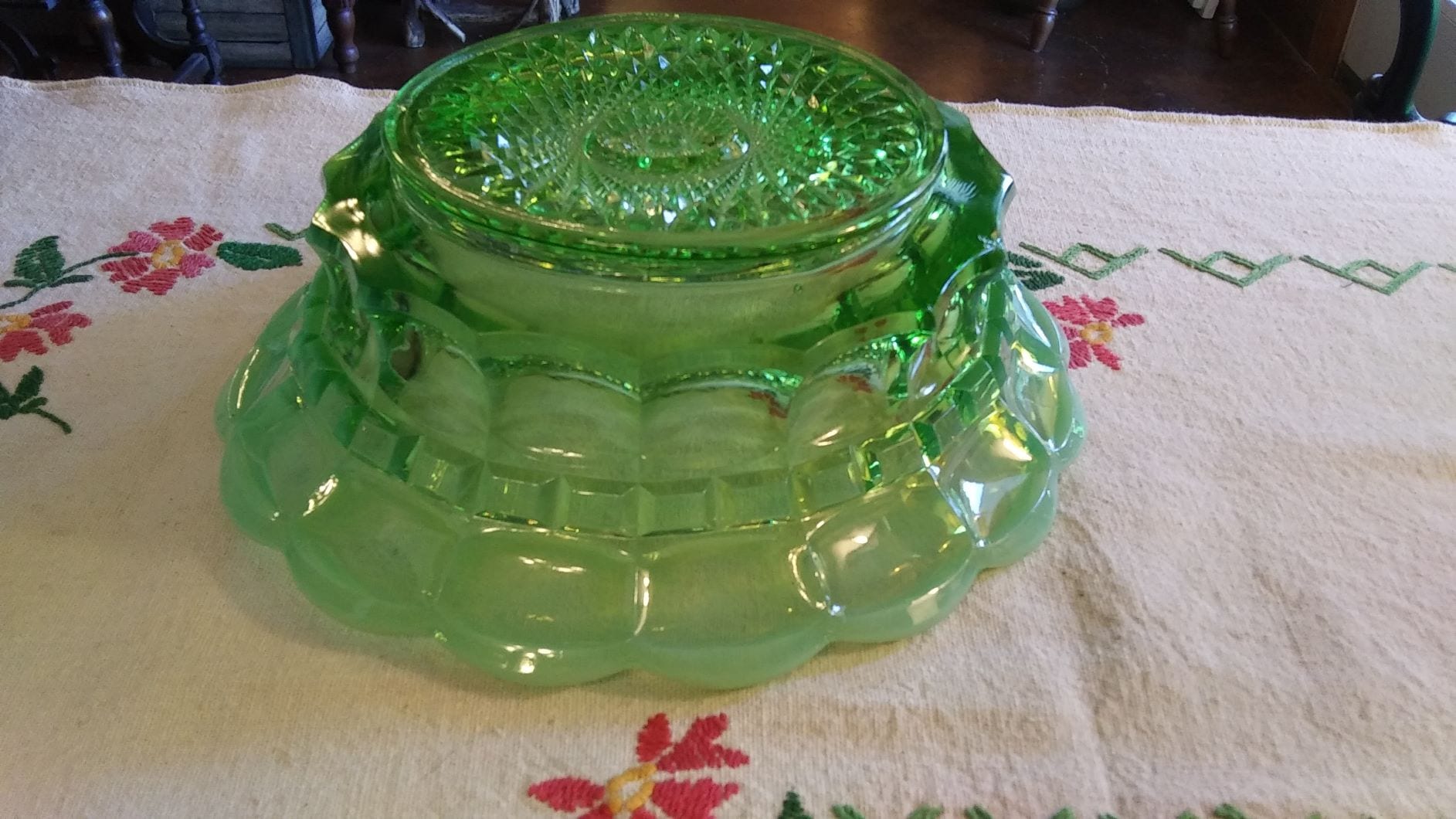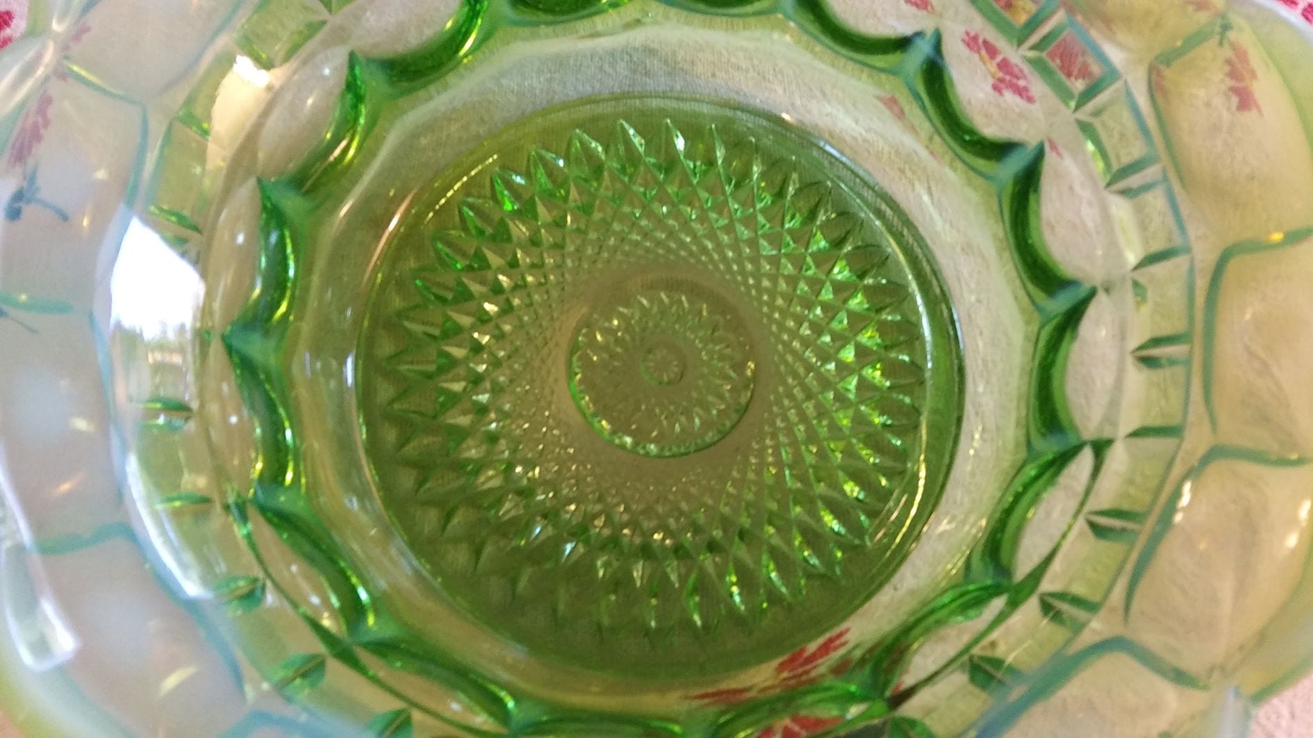 (3) Bowls sold as set, Northwood Opalescent, Circa 1905-1915, Beautiful shades of green. One large bowl measures 8.75″ D x 3″T, Two smaller bowls measures 4.5″D x 2″T, All are in excellent condition and are marked with “N” in the center of bowls. (NOTE: the green has a glow to it and could possibly be vaseline glass), Item 634